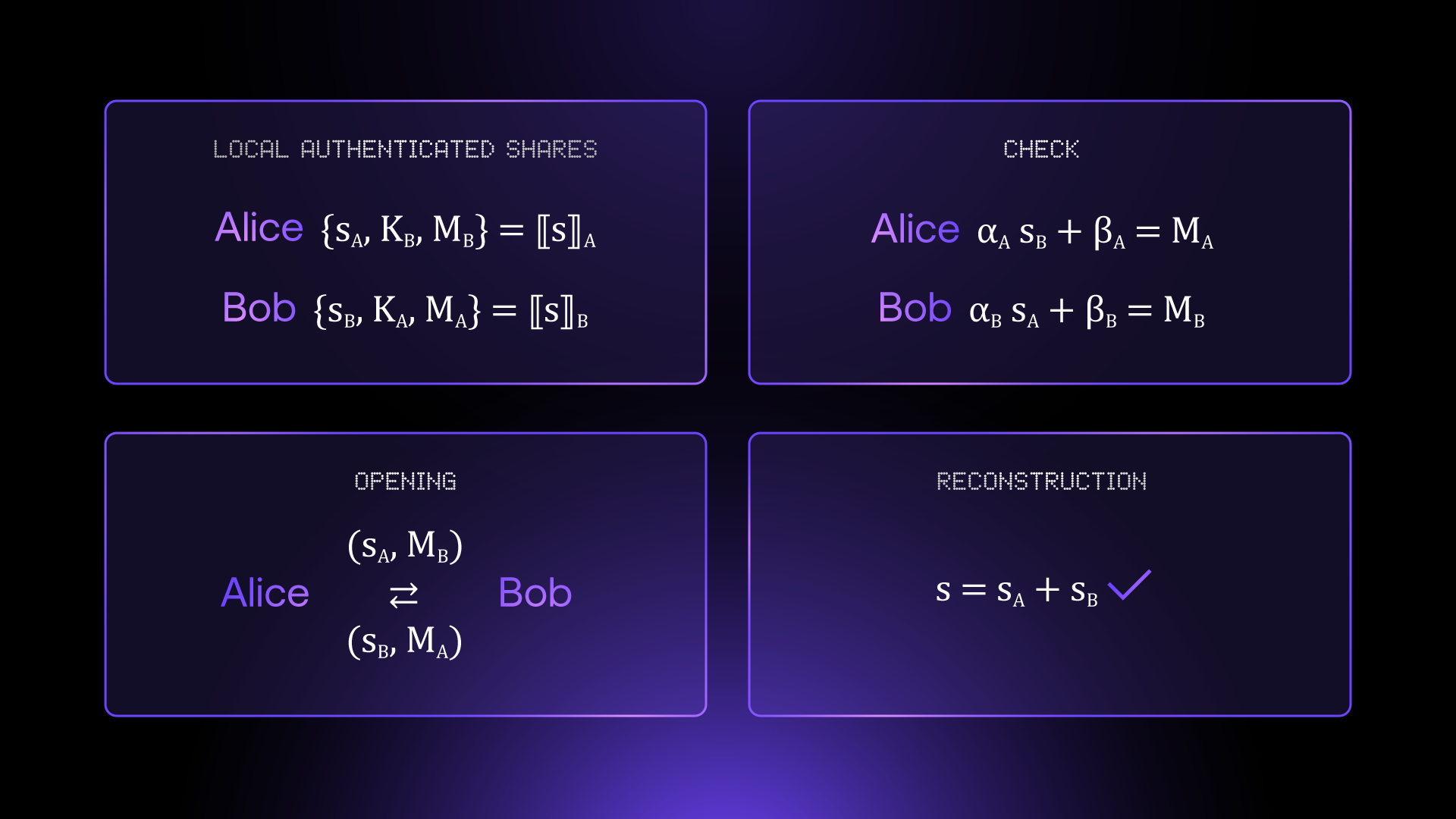 In our protocol, BDOZ, a secret share is authenticated in the following way: say \( x \) is your secret share, \( K = (\alpha, \beta) \) is the receiver’s MAC key, and \( \mathrm{MAC}(x) = \alpha * x + \beta \) is the MAC. Since the sender does not know \( K \), she is not able to compute a correct MAC for any other secret share. And of course, the receiver does not know the sender’s secret share \( x \) in advance. In addition, the scheme is additively homomorphic, meaning there is a way to add two authenticated secret shares together such that the MACs and keys remain correct: